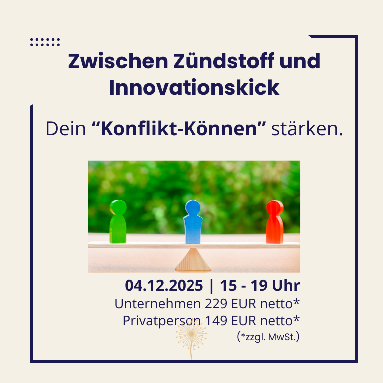 In diesem praxisorientierten Format entdecken die Teilnehmenden, wie aus Reibung Energie wird – für Klarheit, Innovation und bessere Zusammenarbeit. Sie lernen, Konflikte als wertvolle Impulse zu begreifen, statt sie als Störfaktoren zu erleben. Denn schon ein „Ja“ zur eigenen Sicht und ein „Nein“ des Gegen-übers markieren den Anfang eines Konflikts – und zugleich die Chance auf Entwicklung.